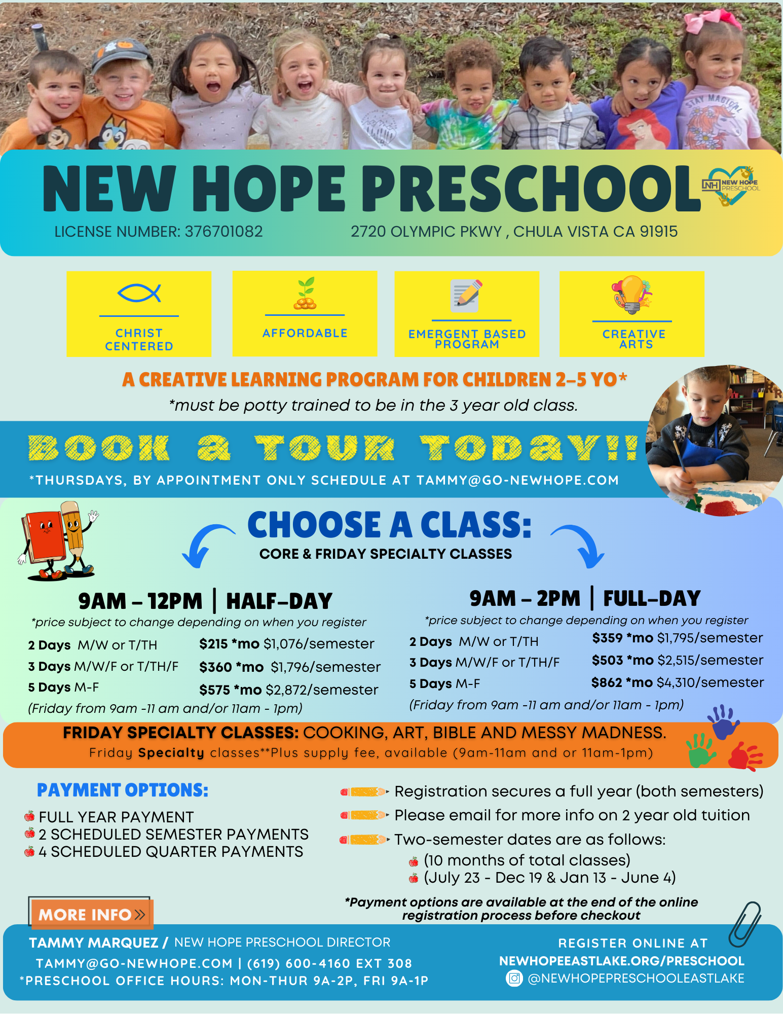 Open to children 2-5 years old. Children must be FULLY potty- trained and turn 3 before starting in the 3 year old class.